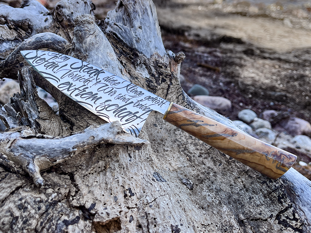 Designe Dein individuelles Messer unter Anleitung und Berücksichtigung Deiner Ergonomie. Wähle Deinen Stahl und suche edles Material für den Griff aus. Dann mach Dich ans Werk, fokussiere Dich und erschaffe Dein einzigartiges und persönliches Messer mit Deinen Händen.
