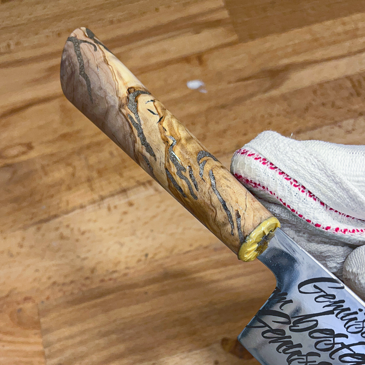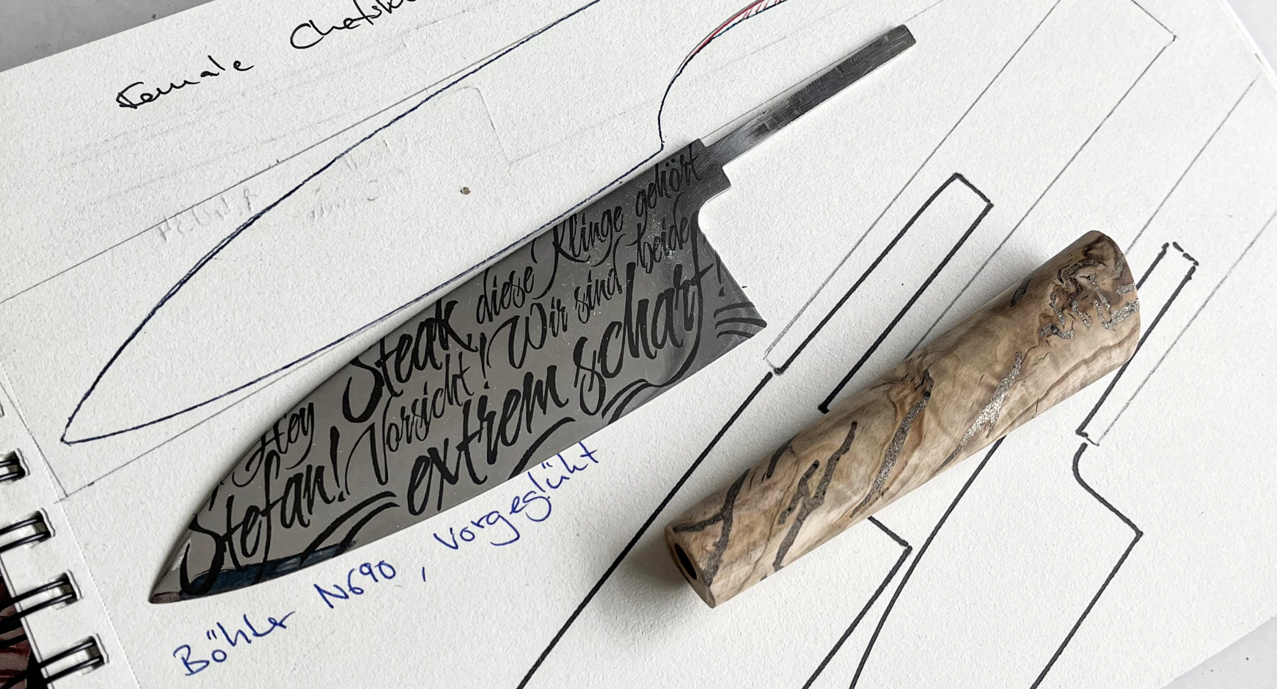 Die Idee ist simpel, aber genial. Japanische Deba-Messer bieten genug Platz für eine umfangreichere Gestaltung, als das bei klassischen Messern dieser Klingenlänge möglich ist. Außerdem wird diese Art Klinge nur auf einer Seite angeschliffen, was deutlich mehr Platz und Gestaltungsspielraum auf der gegenüberliegenden Klingenseite zulässt. Die Typographie wurde exakt an die Klingenform angepasst und lässt auf der Anschliffseite Raum genug zum Nachschärfen. Das Design spielt ganz bewusst mit den Überständen der Schrift über die Klingenränder. Das Designkonzept macht eine Individualisierung der Typographie mit einem Vornamen möglich. Auf eine Humor konnte ich nicht verzichten – das Messerbusiness kommt in meinen Augen oft etwas „sehr ernst“ daher. Ein bisschen Würze des Textes mit einem zwinkernden Auge tut auch in der Küche gut ;-).